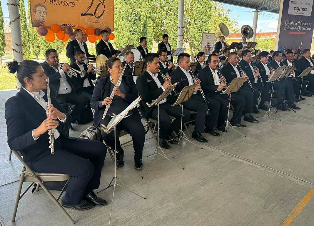 Santiago de Querétaro, Qro., Octubre 02 del 2025.- La Unidad de Servicios para la Educación Básica en el estado de Querétaro (USEBEQ), en coordinación con la Banda de Música del Estado, llevó a cabo el primer concierto didáctico del ciclo escolar 2025-2026, en el que 590 alumnas y alumnos, 29 docentes, madres y padres de familia de la secundaria “Octavio Paz”, del municipio de El Marqués, disfrutaron de esta actividad, con el objetivo de promover el gusto por el arte y expresión artística.