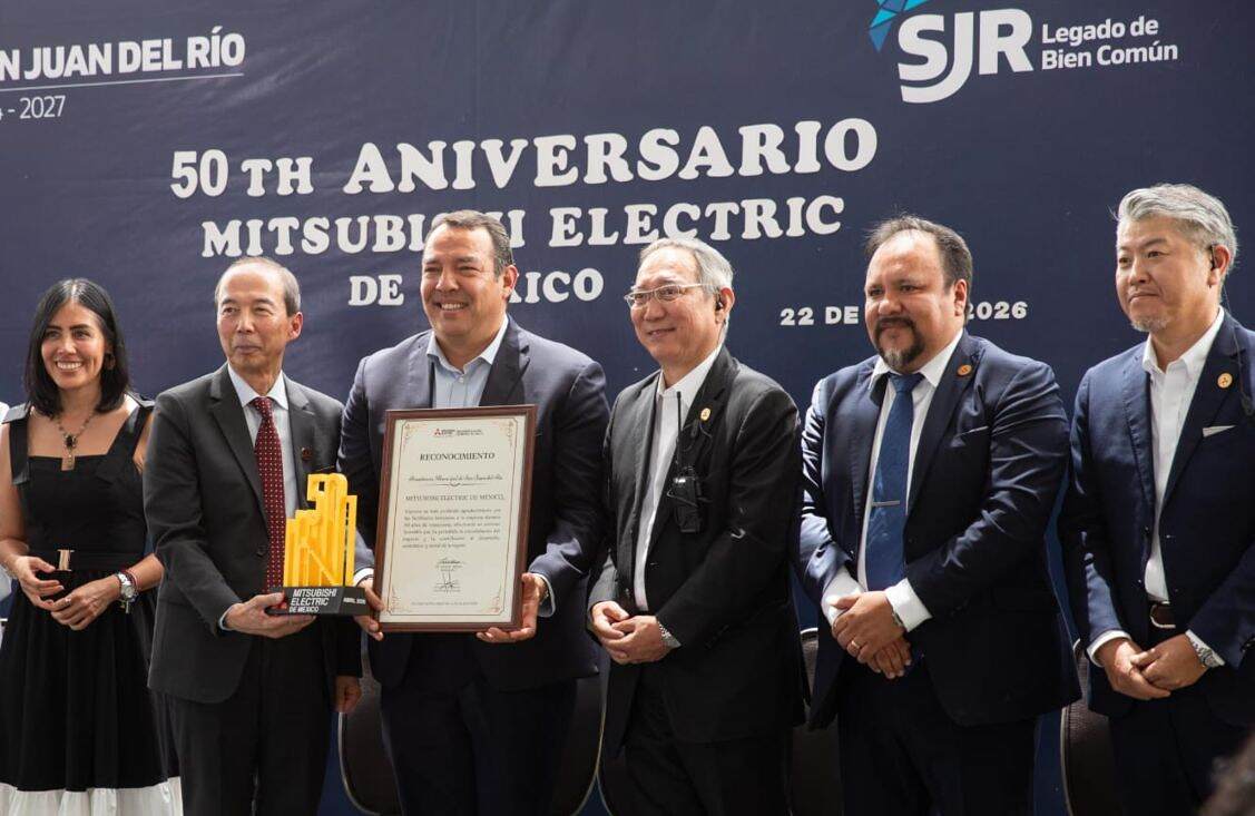 San Juan del Río, Qro., Abril 22 del 2026.- El municipio de San Juan del Río tiene vocación empresarial e industrial, cuenta con talento, ubicación geográfica privilegiada y una sólida tradición productiva, afirmaron la secretaria del Trabajo de gobierno del estado de Querétaro, Liliana San Martín Castillo, y el presidente municipal sanjuanense, Roberto Cabrera Valencia, durante la ceremonia con motivo del 50 Aniversario de Mitsubishi Electric.