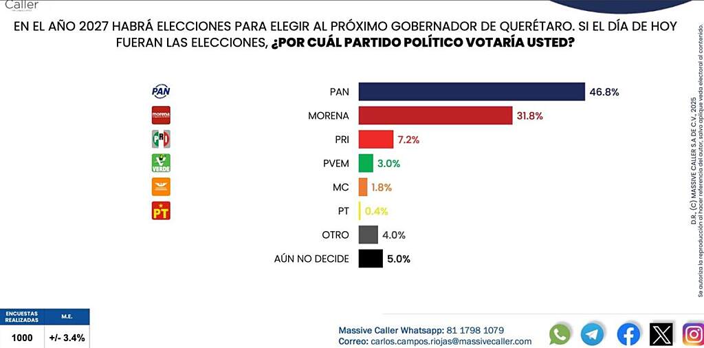 Existen contrastes muy importantes en cuanto a las mediciones que se están realizando hoy en día mientras la empresa Massive Caller, sigue dando un amplio margen al Partido Acción Nacional (PAN), para el cargo de gobernador con un 46.8% contra un 31.8% de Morena; dejando a la cabeza el liderazgo del presidente municipal de Querétaro, Felipe Fernando Macías “Felifer”, quién lo lleva con 23.1 por ciento de la preferencia dentro de los azules; en lo referente a Morena sin duda alguna en esta encuesta se muestra a Santiago Nieto muy fortalecido con un porcentaje de 43 por ciento, que sin duda alguna deja muy atrás a cualquiera de los demás contendientes.