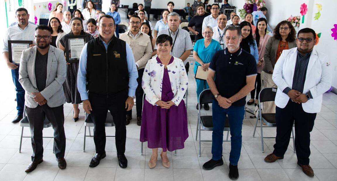 San Juan del Río, Qro., Marzo 09 del 2026.- El presidente municipal de San Juan del Río, Roberto Cabrera Valencia, refrendó su compromiso con la Posada AME, un espacio de la Jurisdicción Sanitaria número 2 de la Secretaría de Salud del Estado de Querétaro (SESEQ) que brinda atención a las mujeres embarazadas, que este lunes celebró su quinto aniversario con un evento encabezado por la titular de la SESEQ, María Martina Pérez Rendón.